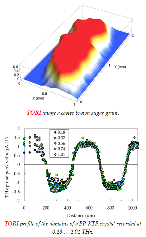 Une autre application de la génération THz est de considérer le signal THz émis par effet non-linéaires dans un échantillon comme la signature de cet échantillon. On parlera alors de spectroscopie d’émission. L’échantillon est ainsi caractérisé à travers l’analyse des paramètres du signal THz (amplitude, forme spectrale ou encore polarisation) généré. L’équipe, soutenue par le Labex FOCUS, a ainsi imaginé une méthode d’imagerie originale, baptisée ORTI (Optical Rectification Terahertz Imaging – imagerie THz par redressement optique). Elle permet d’obtenir une image du rayonnement THz émis par l’échantillon avec une résolution limitée uniquement par la section du faisceau laser focalisé, donc bien en-dessous de la longueur d’onde THz. Cette image renseigne sur la composition chimique de la zone éclairée de l’échantillon, et sur son état cristallographique. Nous avons par exemple ainsi imagé en transmission les domaines d’un cristal de ppKTP avec une résolution spatiale de 10 µm (~l/130 à 0.2 THz). Dans l’objectif de pouvoir caractériser des échantillons très absorbants ou trop épais, une configuration expérimentale en réflexion a été étudiée en collaboration avec l’université d’Aalborg au Danemark. De façon plus ponctuelle, nous avons également conçu une expérience de génération THz par création d’un plasma (filament) dans l’air balayé par un flux d’hélium qui nous a permis d’extraire l’indice de Kerr de l’hélium à partir de l’analyse polarimétrique de l’impulsion THz émise par le filament. Finalement, signalons des travaux plus fondamentaux comme la génération THz dans l’azote liquide en collaboration avec les universités de Moscou et Shanghai, et dans des goutes liquides de l’eutectique In-Sn avec l’Université de Moscou.